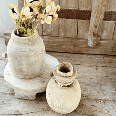 These bleached wooden  pots are made from teak making them perfect for indoor and outdoor use.  Originally used in Village kitchens in north India, perfect piece within your abode to create a statement.